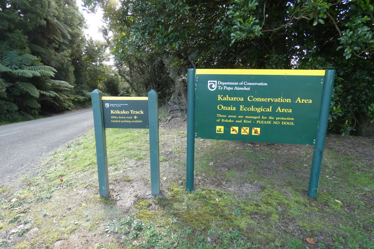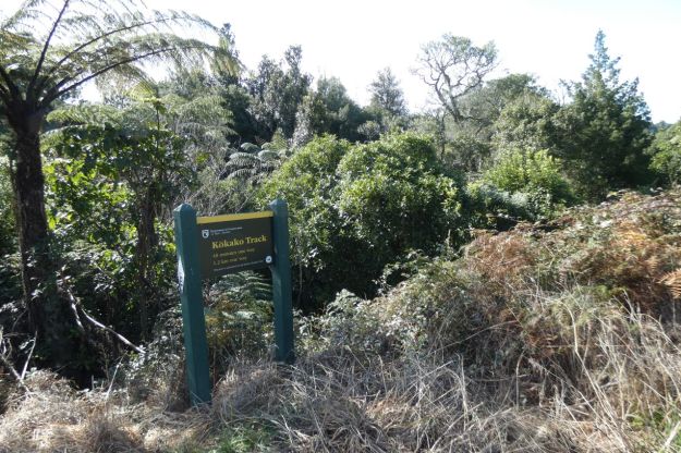 The DoC sign by the small parking area at the start of the track. Here it is just designated as Kokako Track, with a time of 45 minutes and distance of 1.2 km each way.