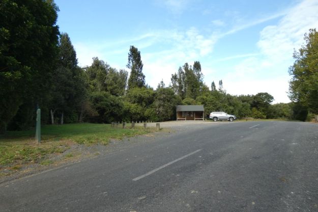 The parking area alongside Kapukapu Road, with a shelter containing three information panels about the conservation area, the kokako, and the trust and pest control program. Looking back towards Kaharoa Road.