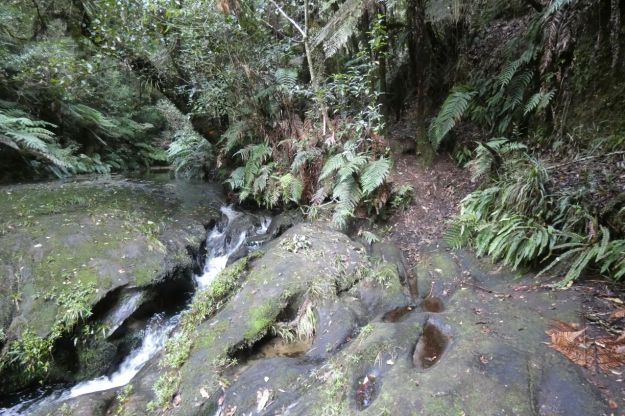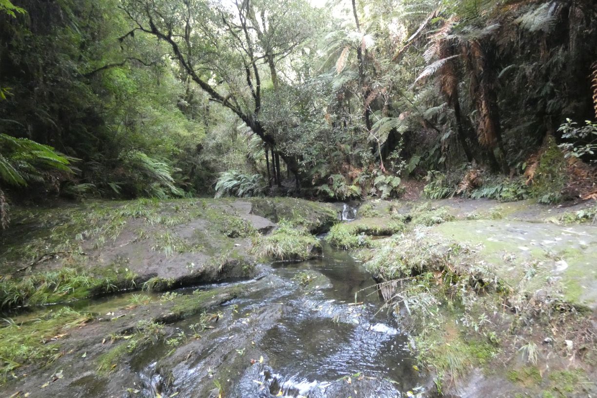 The track (on the right) ends at the Onaia Stream, which has carved its way through the rock. There was evidence of recent flooding of the stream.