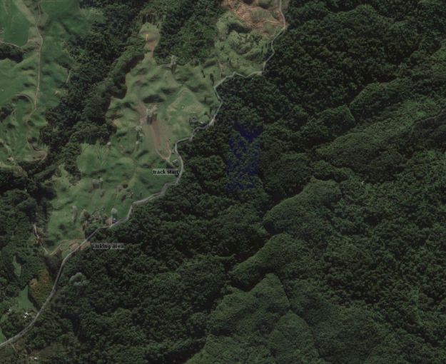 The aerial image, from Google Maps, shows the dense forest canopy at the track and surrounding area, with farmland on the other side of Kapukapu Road.