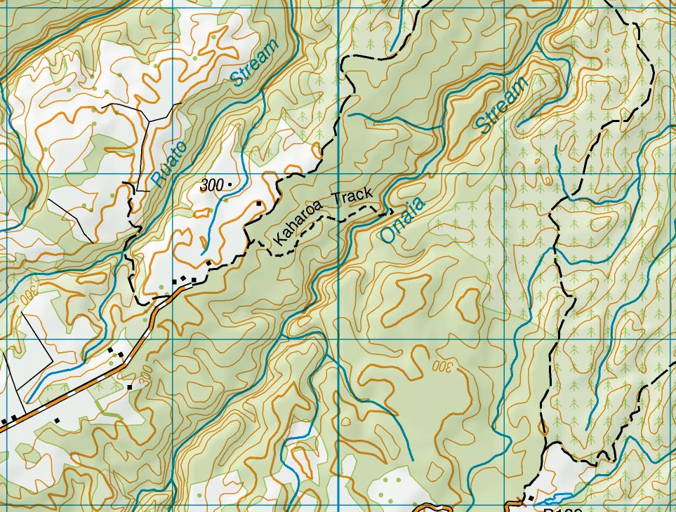 The track is about 1.2 km long, and drops about 100 metres from the start to the end by Onaia Stream. The first part of the track is mostly a gentle contour down a ridgeline, with the last part of the track steeper but with steps at the steepest locations. Return is by the same track. The estimated time for the track itself, according to the DoC sign, is about 45 minutes in each direction. Information about the track can be found on the DoC web site.