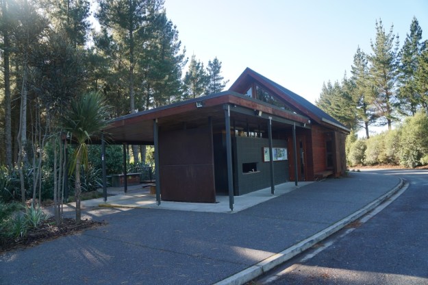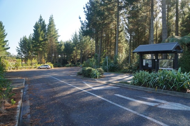 The parking area near the intersection of SH36 and Whataroa Rd, alongside Weld Rd. This is also the starting and ending location of Te Rerenga Track. Information panels are on the right.