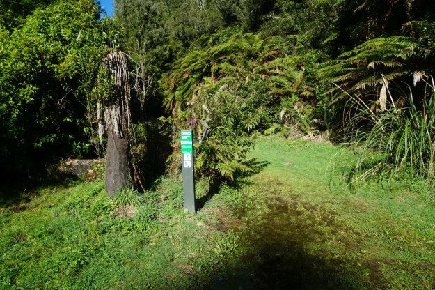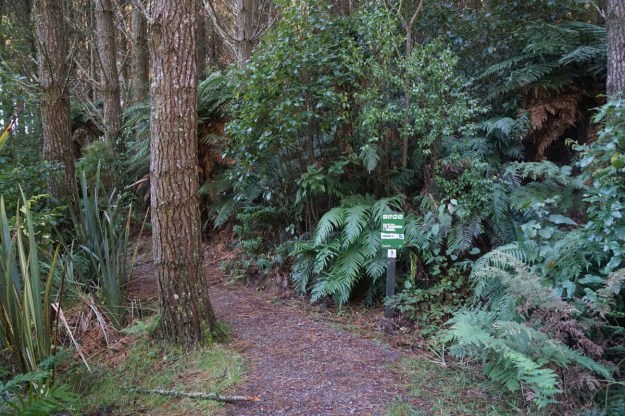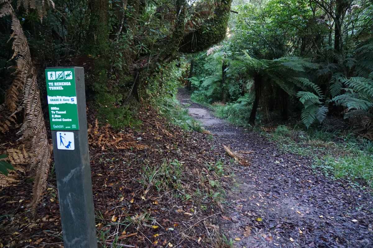 Te Rerenga Track start for walking in an anti-clockwise direction is by the car parking area near the information panel. Here the track is marked as Grade 3, whereas most other markers show the track as Grade 2 Easy. Dogs on a leash are allowed on the track.