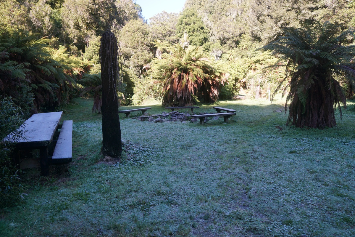 Petersons Camp has a large table and benches around a pit fireplace. On this day there was frost on the ground.
