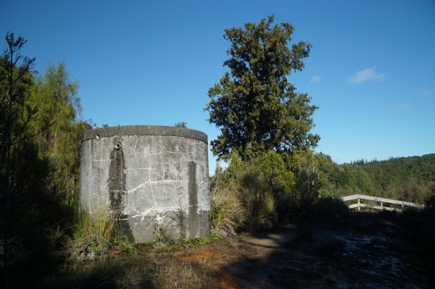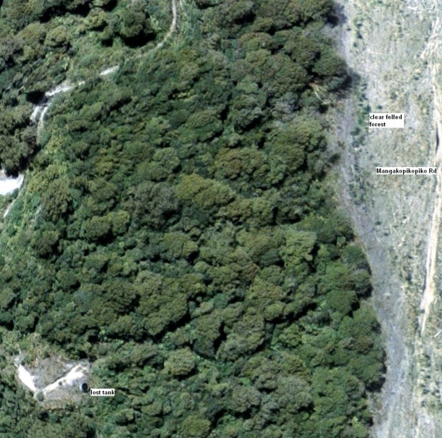 The lost tank at the end of the track, with a large old rimu tree behind it to the right.