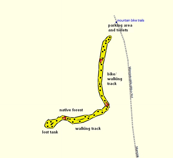 The Lost Tank track in the TECT All Terrain Park is a very short and easy walk, starting from the Mountain Bike Hub in the park. From the Park entry drive to the end of Weld Rd, turn right onto Te Ara Raho Rd and left onto Mangakopikopiko Rd. At the end of the road is a large parking area with toilets.