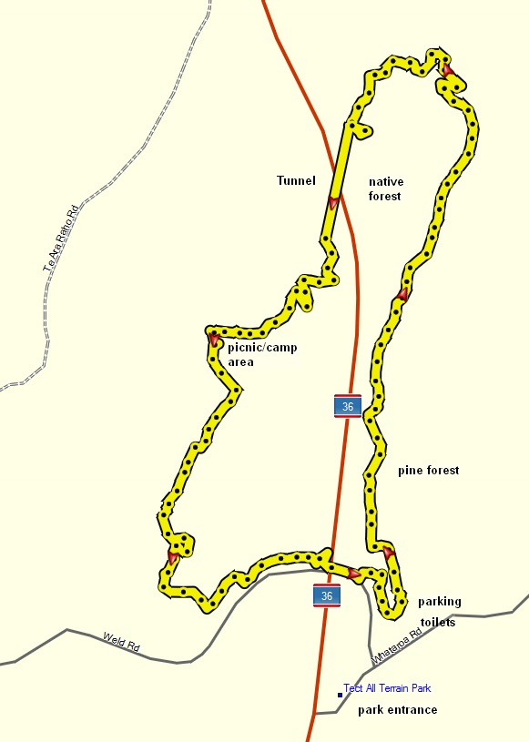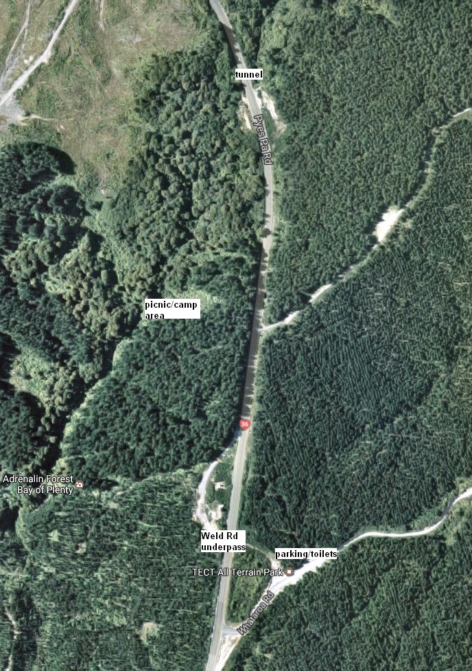 The TECT All Terrain Park is located about halfway between Tauranga and Rotorua, straddling SH36, and accessible from Whataroa Road. It is divided into two main zones, with various activities in each zone. The motorsports zone is located to the east of SH36, and the activity zone, off Weld Road, to the west of SH36. The park covers 1650 hectares of pine and native forest, with parts of the pine forest being clear felled at various times. Information about the park is found on the TECT All Terrain Park web site, including panoramic aerial photos of the park, maps, and details of activities.