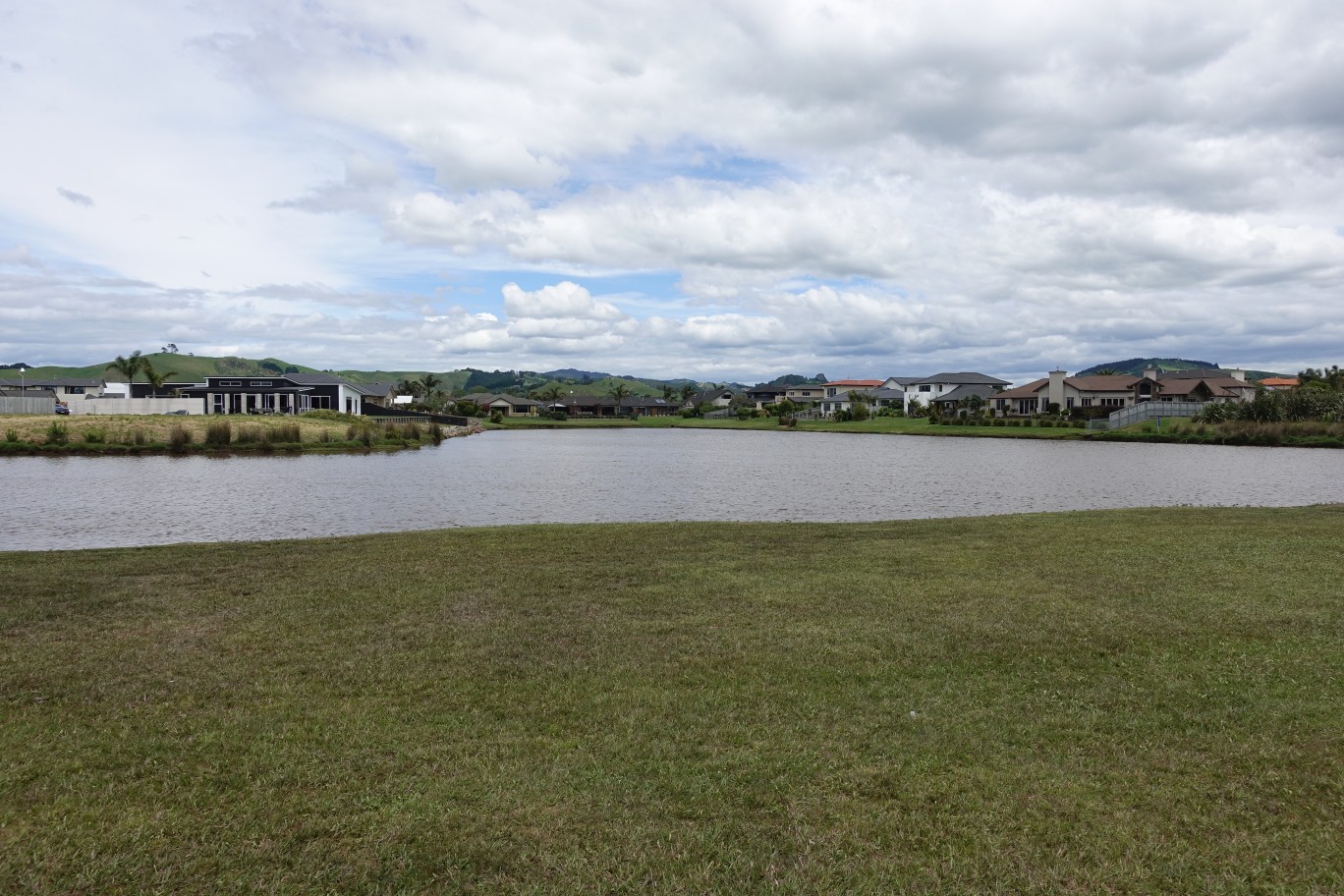 Houses line the reserve on the southern side of the lake. Papamoa Hills Cultural Heritage Regional Park is in the distance on the far left, with Kopukairua on the right.