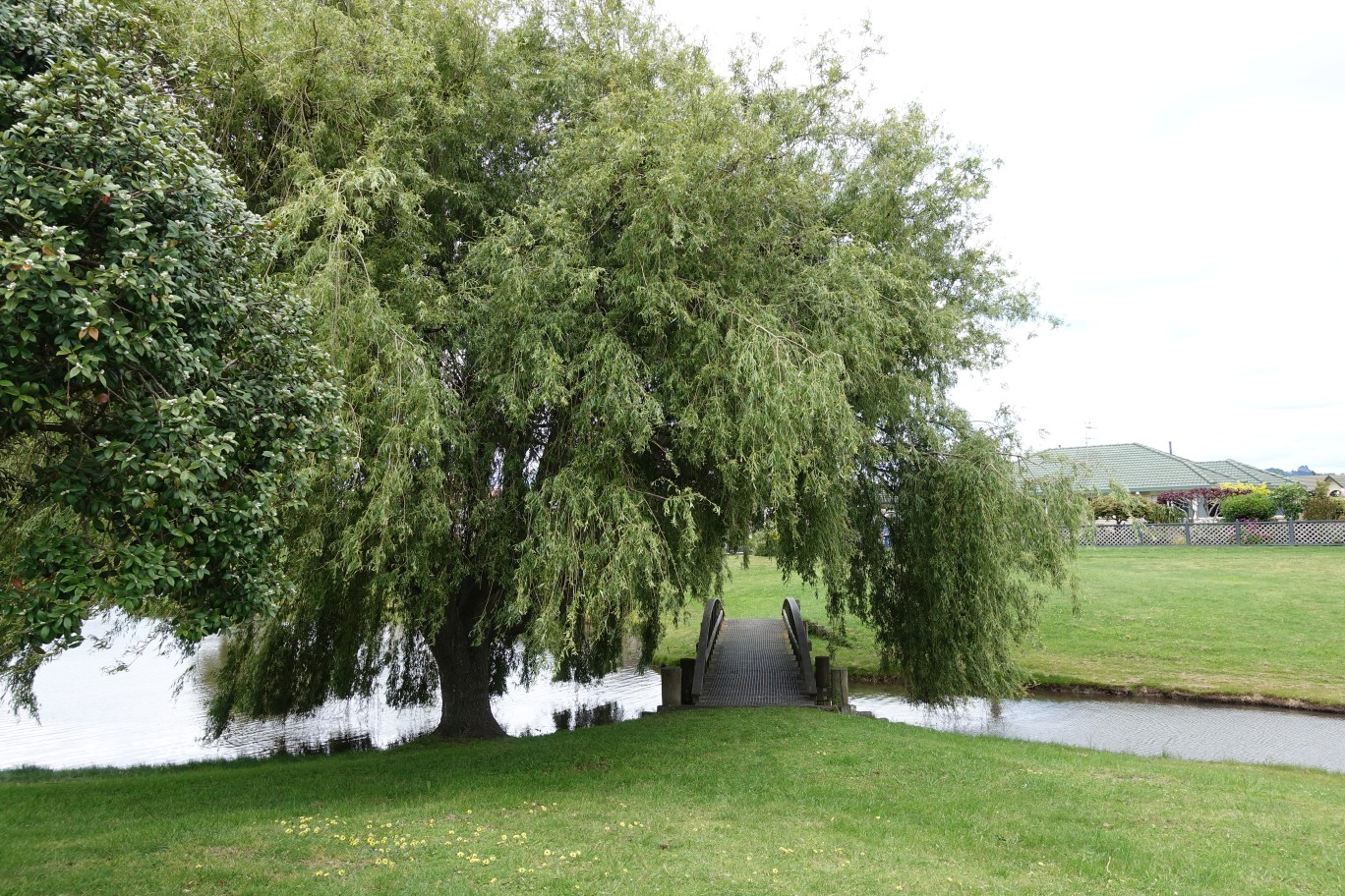 Another bridge across the lake, almost hidden by a weeping willow tree.
