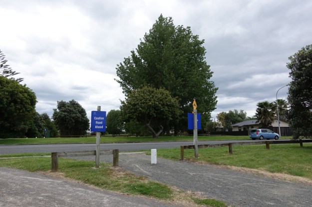 The entrance to the walkway/cycleway off Domain Rd, with the initial part running alongside the back of the Pak’n’Save supermarket, off-picture on the right. Kopukairua is visible in the distance at picture centre.