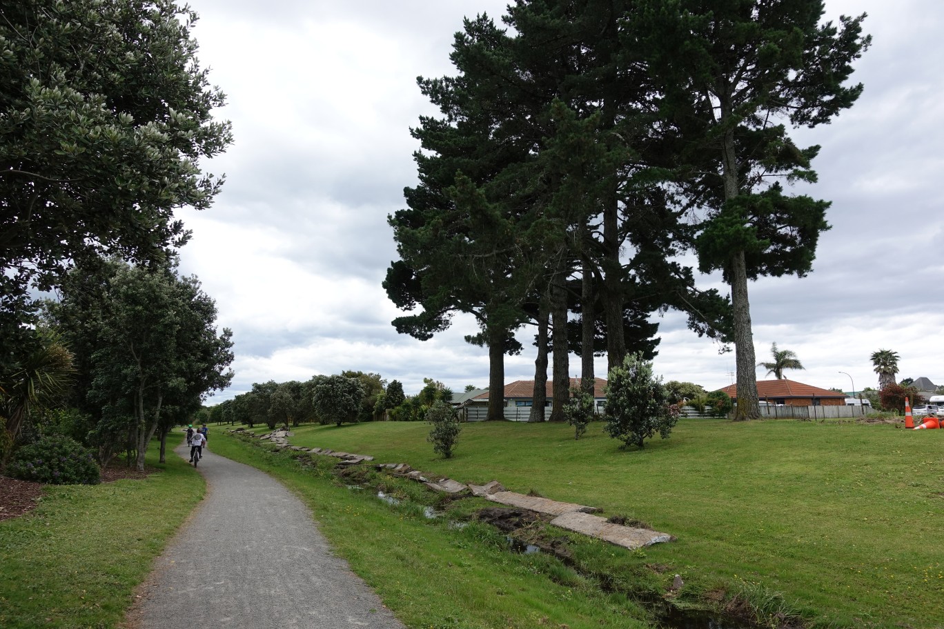 The walkway and cycleway through Wairakei and Topaz Drive Reserves, described in the previous post, continues through the Papamoa drainage reserve (now known as Te Ara O Wairakei) from Domain Road for about 3.3 km, crossing over several streets, and ending at Pacific View Road. There are side tracks leading to various streets bounding onto the reserve. The track can be walked as part of a loop including Papamoa Beach, or returning to Domain Rd by Papamoa Beach Rd, or as in the walk described here returning by the same route through the reserve.