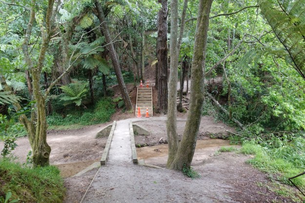 The connecting track has a few steps and crosses over a stream.