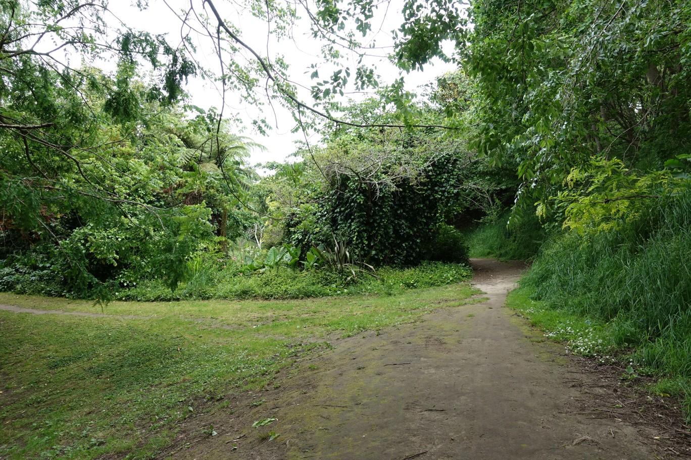 Where the grass area opens out the unformed track joins with the track leading to Revell Drive (to the right) and McFetridge Lane (to the left). Coming in the opposite direction it’s not obvious where the track to Rowesdale Drive branches off, as there is no formed track through the grass.