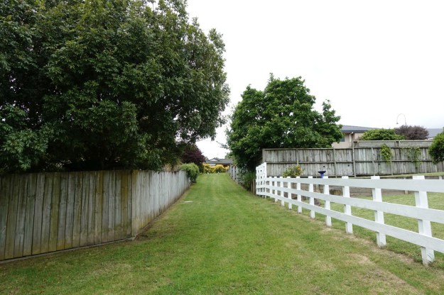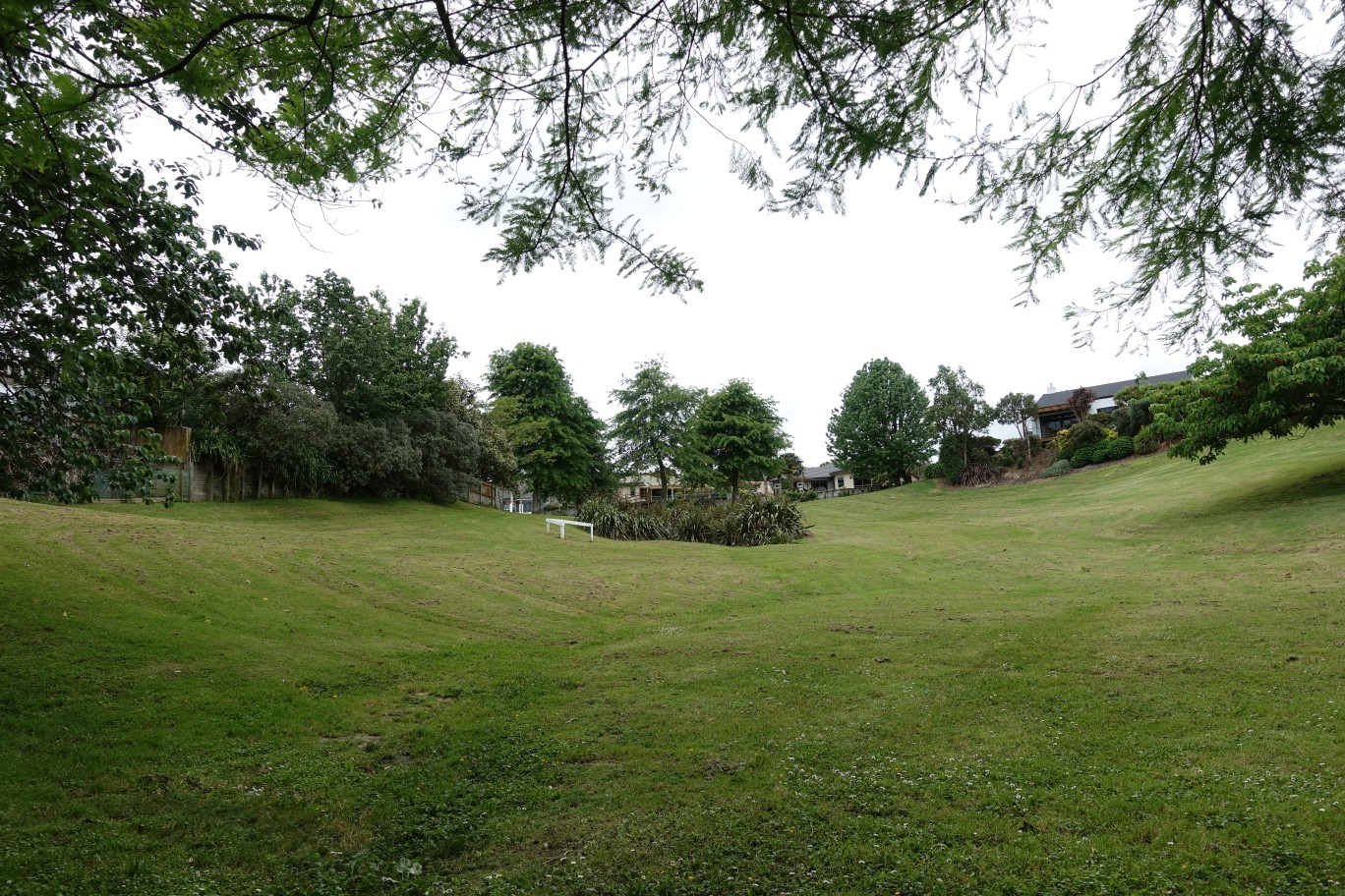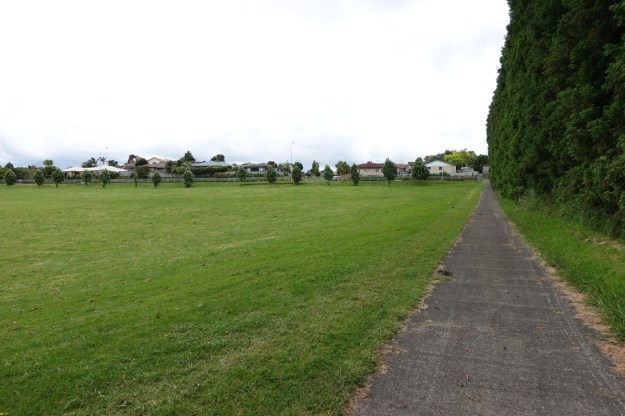 A track runs alongside the large grass area alongside Ohauiti Rd, behind the vegetation to the right, with a row of pine trees alongside the track.