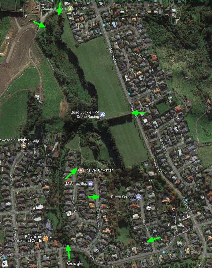 Ohauiti Reserve runs parallel to and partly alongside Ohauiti Road between McFetridge Lane and Rowesdale Drive. A number of walking tracks run through and across the reserve, with areas of bush, wetlands, open grassland, and flood plains. The reserve tracks are included in the brochure Tauranga Walkways and Cycleways, available for download from the Tauranga City Council web site.