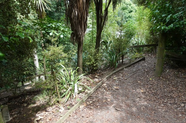 The rails and steps and track to the right leads down to the lower track alongside Waitakaruru Stream.