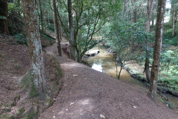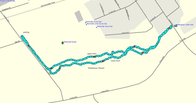 The Morrinsville River Walk is a walking track about 1.5 km long between the entry to the Morrinsville Recreation Ground on Avenue Road South and Studholme Street, running through a forested valley parallel to the Waitakaruru Stream for most of the way. Starting from Avenue Road South, where parking is available, the first 300 metres or so of the track is on open ground alongside Avenue Road South. It then enters the forested area, with two alternative tracks. One lower down alongside and close to the stream, and one higher up alongside the recreation reserve boundary. This walk was done in both directions, using the lower track on the way to Studholme Street and the upper track on the return.