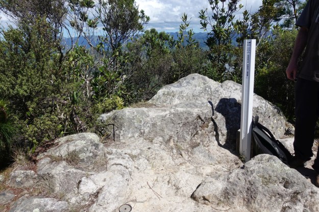 The trig station is a short distance (about 2 minutes walk) from the lookout. The trig station structure has been replaced by 3 plastic marker posts, but the location marker (at very bottom edge of photo) and plaque (behind the plastic post) are present. Elevation is 387 metres above sea level.