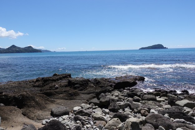 Looking towards Pauanui from the cave at Cave Bay. The walk back to the carpark continues along the rocky foreshore.