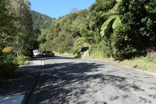 Some parking is available on Garden Tce. The entry to the narrow bridge and to Tirohanga Track can be seen near the upper right.