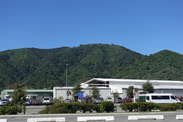 View of the hills with the lookout to the right of the highest point near picture centre, looking from the waiting queue for the ferry crossing.