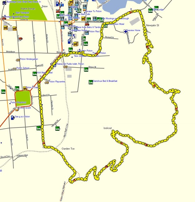 The entrance to the track from Newgate St is on the steps at picture centre. It is possible to park on the street while doing the walk to the lookout.