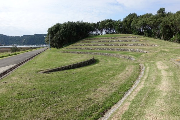The Whakatane Amphitheatre is alongside the walkway, with the railway line from Whakatane Miniature Railway adjacent to the walkway.