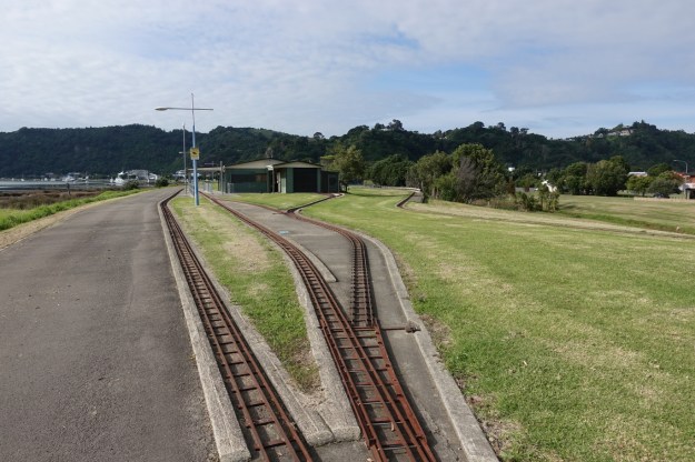 The railway station and railway lines for the Whakatane Miniature Railway alongside the walkway, between the Mcgarvey Road and Peace Street/McAlister Street access points.