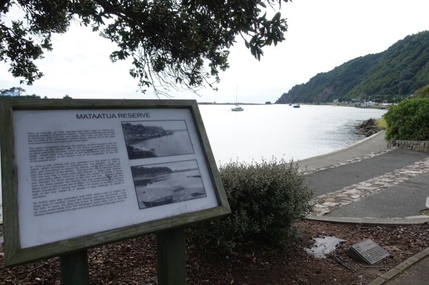 The last part of the walk to the heads follows Muriwai Drive, and can use either the grass area or the footpath alongside the road. The rock to the left of centre with the vegetation on top is Te Toka Tapu, the one mentioned on the plaque as the first landing point of the original Mataatua canoe.