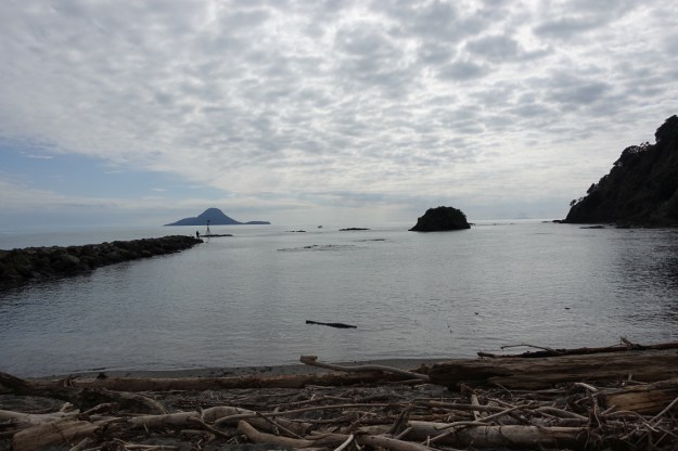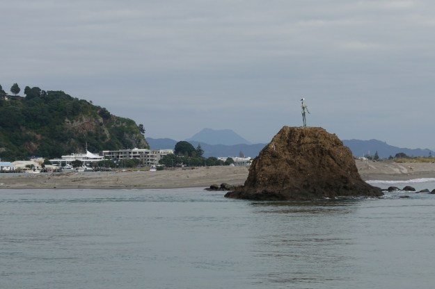 Looking back from the Whakatane Heads with the statue of Wairaka, which often has a seagull perched on it. The summit of Putauaki/Mt Edgecumbe is in the distance, between the statue and the cliffs of Hillcrest above Whakatane.