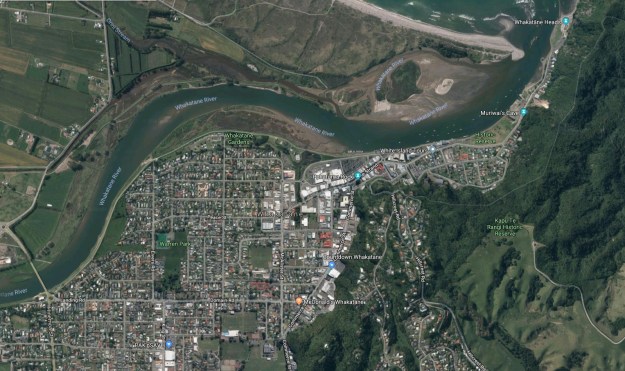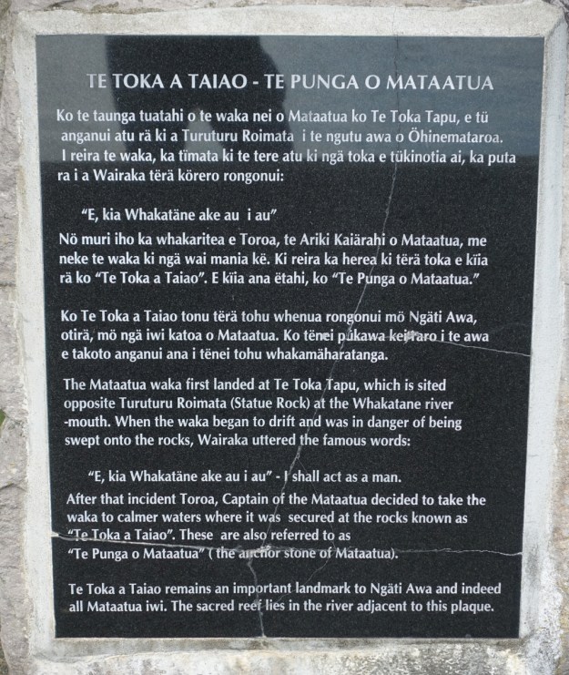 Looking towards the river mouth the volcanic Whakaari/White Island can be seen in the distance between the two prominent rocks. The rock on the left has the statue of Wairaka on it.