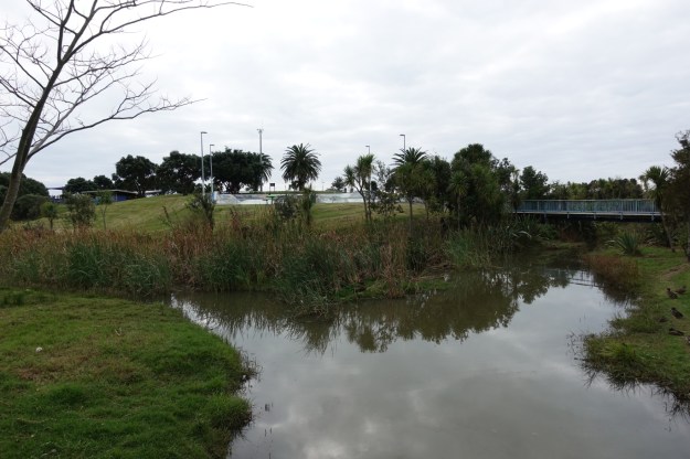 The walkway passes under the SH30 bridge, before again climbing onto the top of the stopbank. The rowing club rooms are on the right.