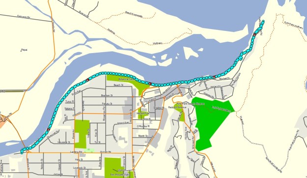 The GPS tracklog shows the walk and cycleway path, from Landing Road at bottom left, to Whakatane Heads at top right. The total length is 4.5 kms, with a total distance of 10 km walked for both directions and a few short side tracks to access points, etc. For one direction the walking time was 50 minutes, with the total walking time for both directions being 2 hours.