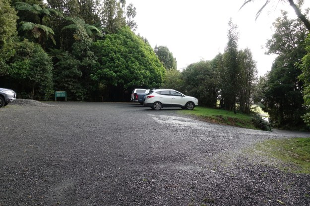 The parking area at the end of Corcoran Road, with Corcoran Rd on the right. Tirohanga Track and the track to the nearby picnic area and lookout is to the left of the large sign. The short track to the toilets is to the right of the sign.