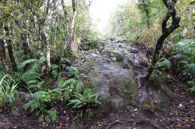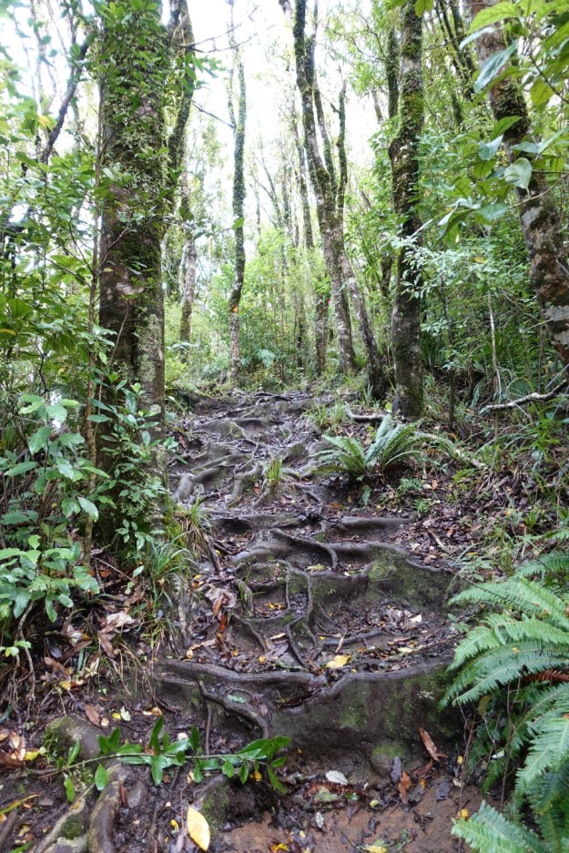 There are also short sections of rock to be crossed. Both the tree roots and the rocks can be very slippery when wet. There were also short stretches of muddy track, but these could usually be bypassed without much difficulty.