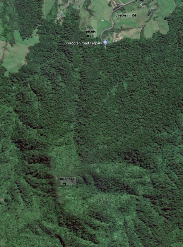 There is a parking area at the end of Corcoran Road, with a basic DoC toilet adjacent to the carpark. A very short walk along an easy well-formed track from the carpark leads to a picnic area with a lookout. Tirohanga Track also starts at the carpark, which is about 350 metres above sea level, and climbs to Ruapane Trig which is 723 metres asl. The first part of Tirohanga Track has about 463 formed steps in short stairways varying from about 6 to 18 steps long. The track gets steeper and rougher as it approaches the junction with Ruapane Track, and the last part approaching the lookout and trig is quite steep and rough.