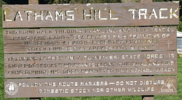 The sign on SH30 next to the stile and the start of Lathams Hill Track. The sign mentions two sign posted access points to Awakeri State Forest. No signs were seen on the track, and presumably there is no longer any state forest at Awakeri. The logo at lower left reads “New Zealand Forest Service”, which was abolished in 1987, but resurrected as Te Uru Rakau in May, 2018.