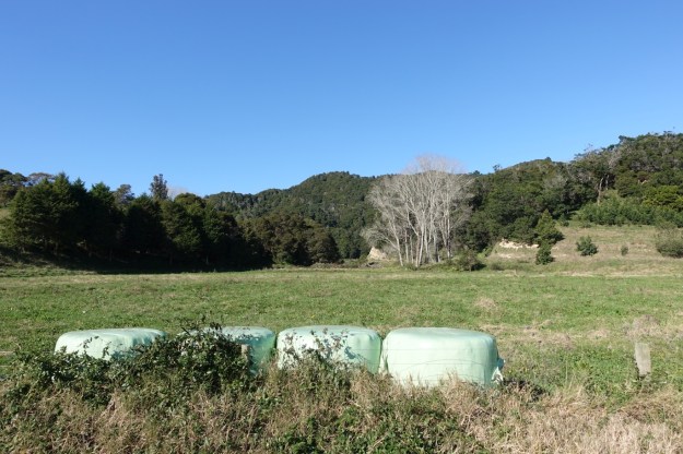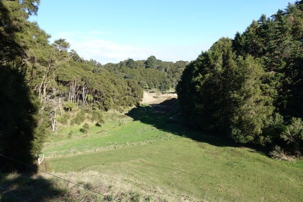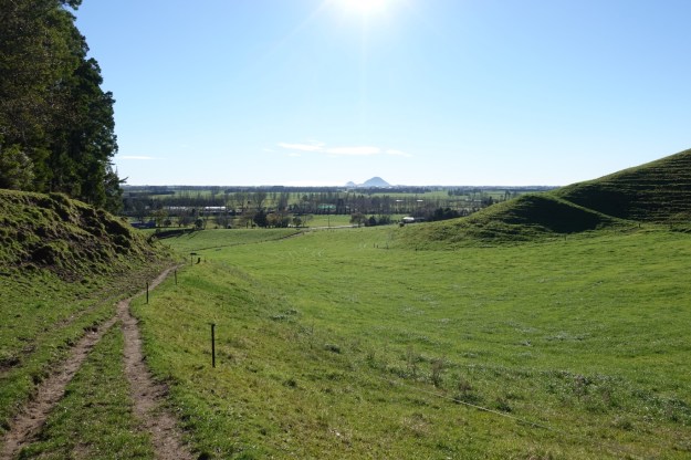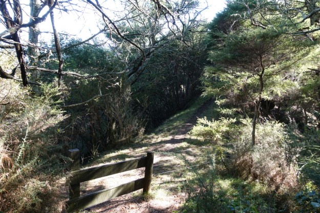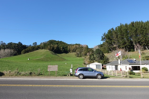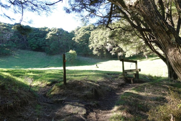 The small parking area by SH30. The track starts with a climb over a stile just to the left of the parked vehicle, before climbing gently through farmland and patches of regenerating bush.