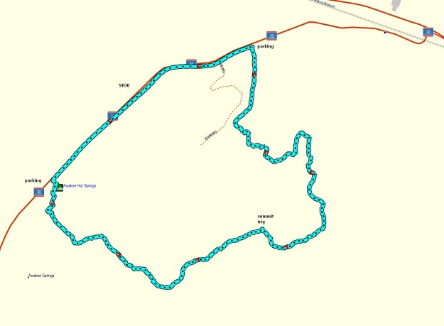 The GPS tracklog shows the route taken, starting from the parking spot at the top of the tracklog, and continuing in a clockwise direction. SH30 is about 20 metres above sea level and the trig station is 240 metres asl. The times and distances were: