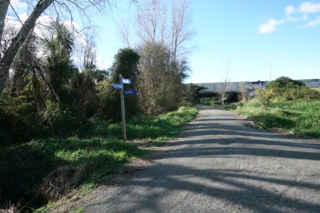 From the bridge across Kopurererua Stream near Wylie Street a track heads straight alongside a drain or stream back towards the city. Partway along this track there is an older bridge leading to the western track running alongside Kopurererua Stream.