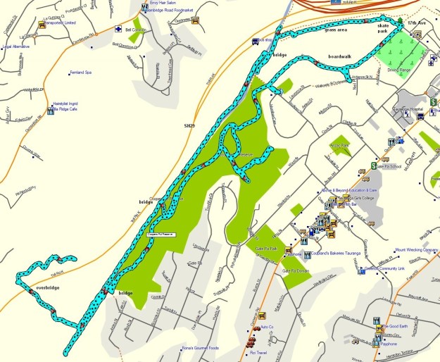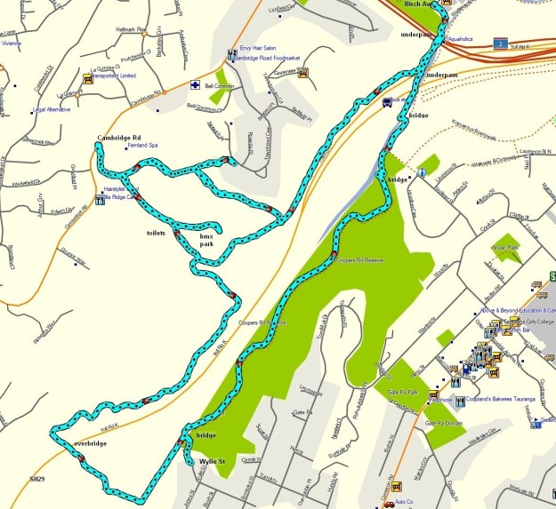 Day 2 started and ended at Wylie Street, crossing the nearby bridge and the new Whakapaewaka Bridge, past the BMX park to Cambridge Road, along the main track and another side track to Cambridge Road, before continuing on to Birch Avenue, back under SH2 and SH29 to the two bridges over Kopurererua Stream on either side of Faulkner Street acess track, and the track following the western side of the stream back to the bridge by Wylie Street. Total distance 10.7 km in 2.25 hours.