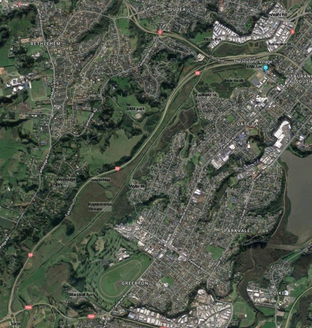 Kopurererua Valley is a low-lying area about 5 km long covering an area of 300 hectares, with Kopurererua Stream running through it, from Tauriko at the southern end and Waihi Road at the northern end. The valley is bisected by Takitimu Drive, a toll road, which is part of SH29. The ridge on the western side of the valley has Cambridge Road running along the ridgeline, and the ridge on the eastern side has Cameron Road running along the ridgeline. The Whakapaewaka Bridge across Takitimu Drive, officially opened in early August 2018, allows walkers and cyclists to cross over from one side of the valley to the other, near the midpoint of the valley.