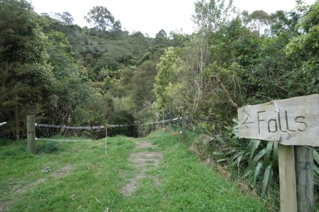 The entry point to the waterfall track, through the electric fence gate. The track starts with a short descent to the new bridge over the Karaponga Stream.