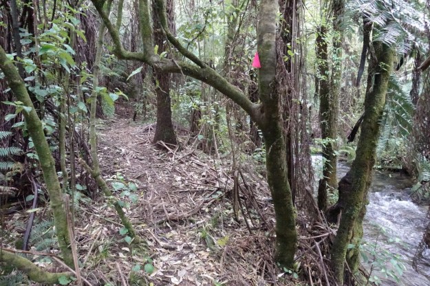 The track is narrow and slippery in places, and also has steeper and rougher sections. There are triangular track markers along the way. The stream can be seen alongside the track to the right.