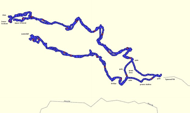 The GPS track log shows the route followed for the walk to both the waterfall and the dam. The approximate distances and times were: