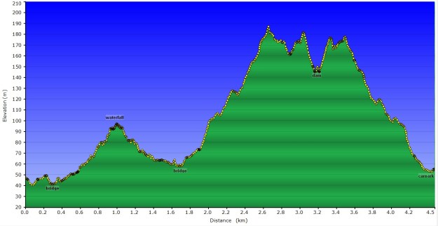 The GPS track log can be shown as an elevation profile. Unfortunately the elevation readings from a GPS are not as accurate as the location readings, and tree cover and steep hillsides make the readings even more variable and inaccurate. The elevation graph shows the progress starting from the carpark and returning to the carpark after taking the track to the waterfall and the track to the dam. The two ends of the graph should be at the same elevation, and these are reasonably close. However the two locations of the same bridge differ by about 20 metres. Similarly the two highest peaks on either side of the dam location should be the same height, but differ by about 10 metres. The graph does give an indication of the elevation changes along the tracks, with a difference of about 140 metres between lowest and highest points.