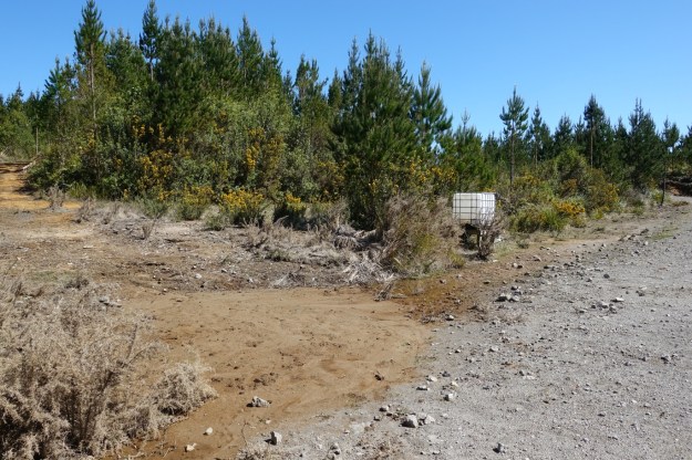 The same road/track was followed back to the carpark, with short walks down the two side tracks shown on some of the photos to show their locations on the GPS tracklog. After leaving the valley with native forest most of the track has no shade. At least until the recently planted pine trees grow taller.