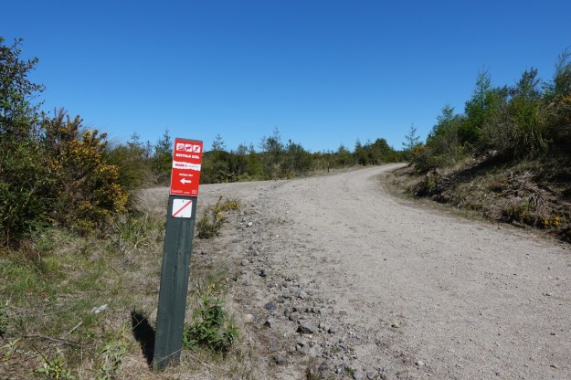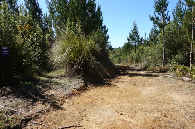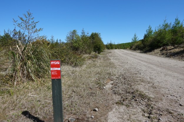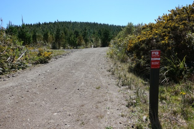 The start of the track, which is actually a forestry road, by the carpark. The Lost Tank Track branches off by the marker post to the left of centre. The Equestrian Link sign is probably in the wrong location, as the shortest route to the radio repeater from here is about 2.8 km, not 1.5.