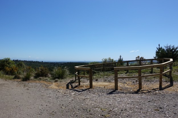 There are extensive views from the radio repeater site. The peak to the left of centre is Otanewainuku. The Lookout Drop mountain bike track starts by the signpost on the right.