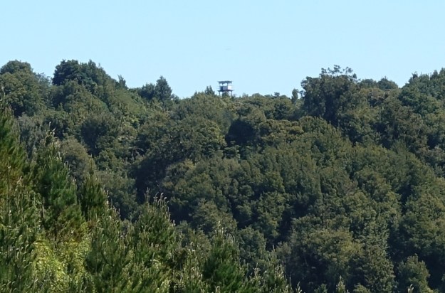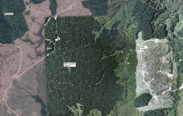 A lookout on the nearby summit of Puwhenua (622 metres above sea level) is just visible from the repeater site. The repeater is at about 580 metres asl.